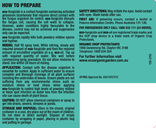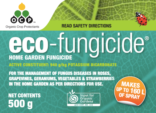 Eco-fungicide is a registered organic fungicide for the control of powdery mildew, black spot and rust in many plants including tomatoes, zucchini, roses, grapevines and geraniums. It attacks existing fungal infections and kills external fungal growth within minutes. eco-fungicide also leaves an invisible protective coating that prevents new spores from germinating.